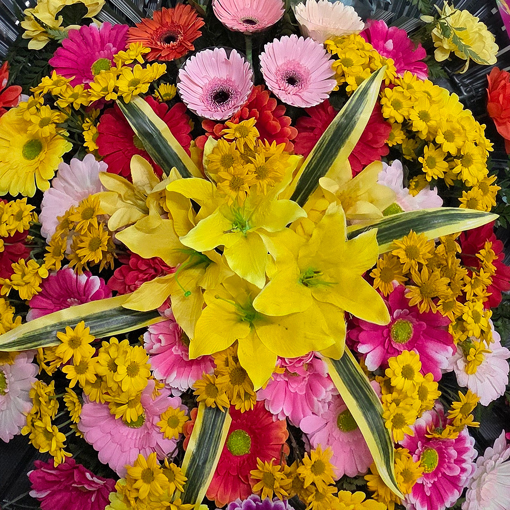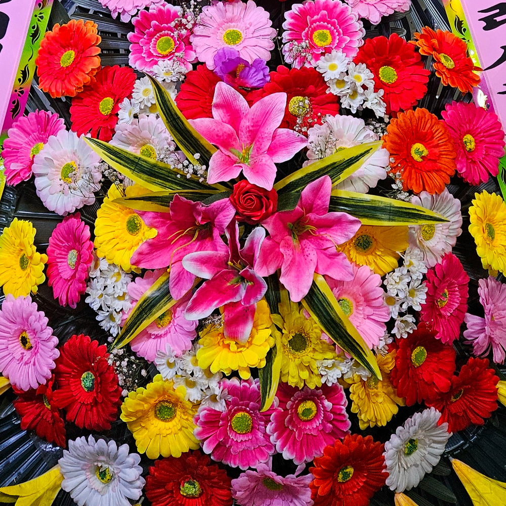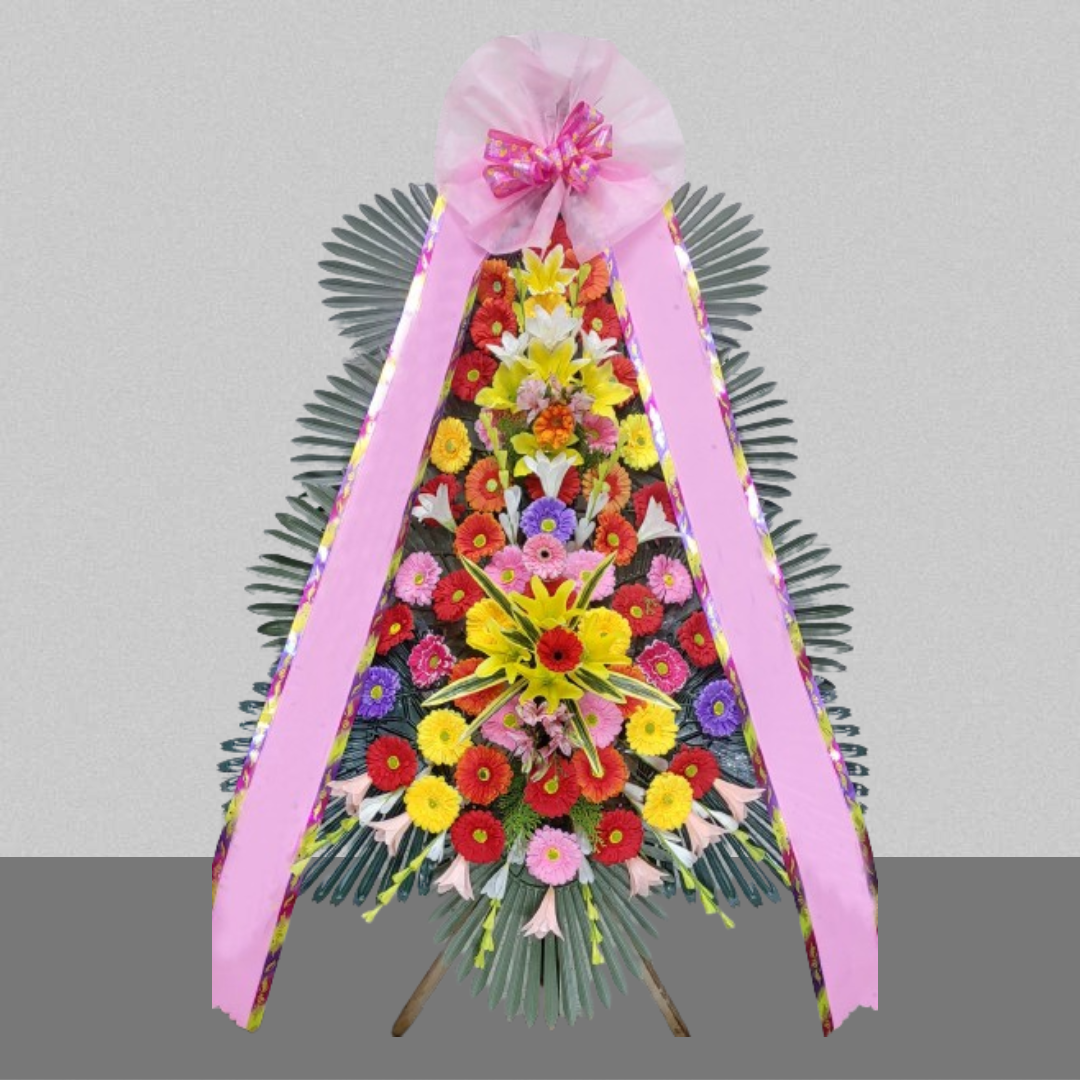 거베라,장미등으로 꽂으며 여러가지 꽃을 혼합하여 제작하기도 합니다. 모양이 화려하여 연회장등의 축하용으로 널리 애용됩니다.