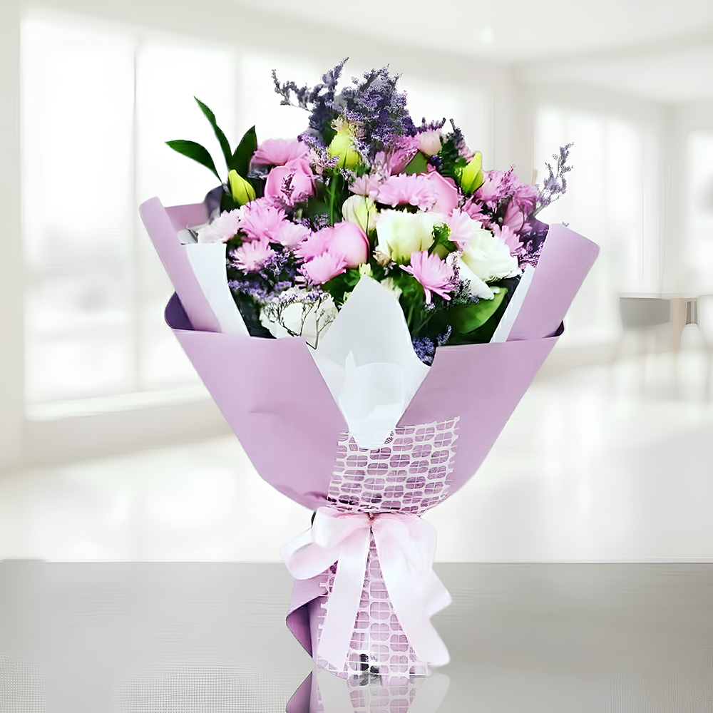 붉은 장미와 백합을 주소재로 사용한 아름다운 꽃다발입니다.