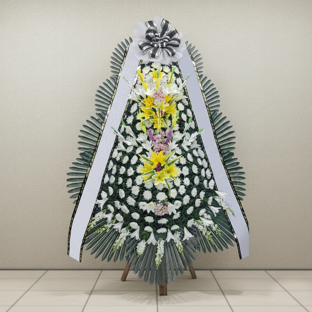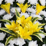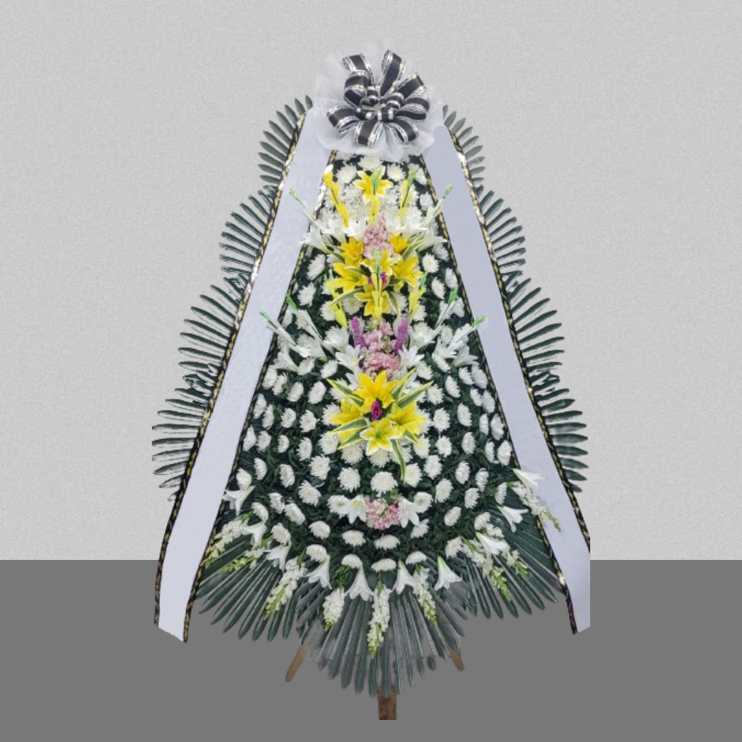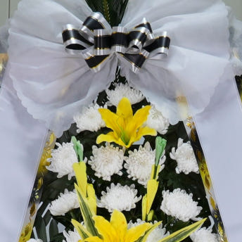 국화대국(황,백)을 사용하여 상가나 추도용으로 만든상품입니다. 도시루잎이나 몬스테리아 등 그린소재를 사용하고 계절에 따라 극락조, 백합, 글라디오라스 등으로 포인트를 주기도 합니다.