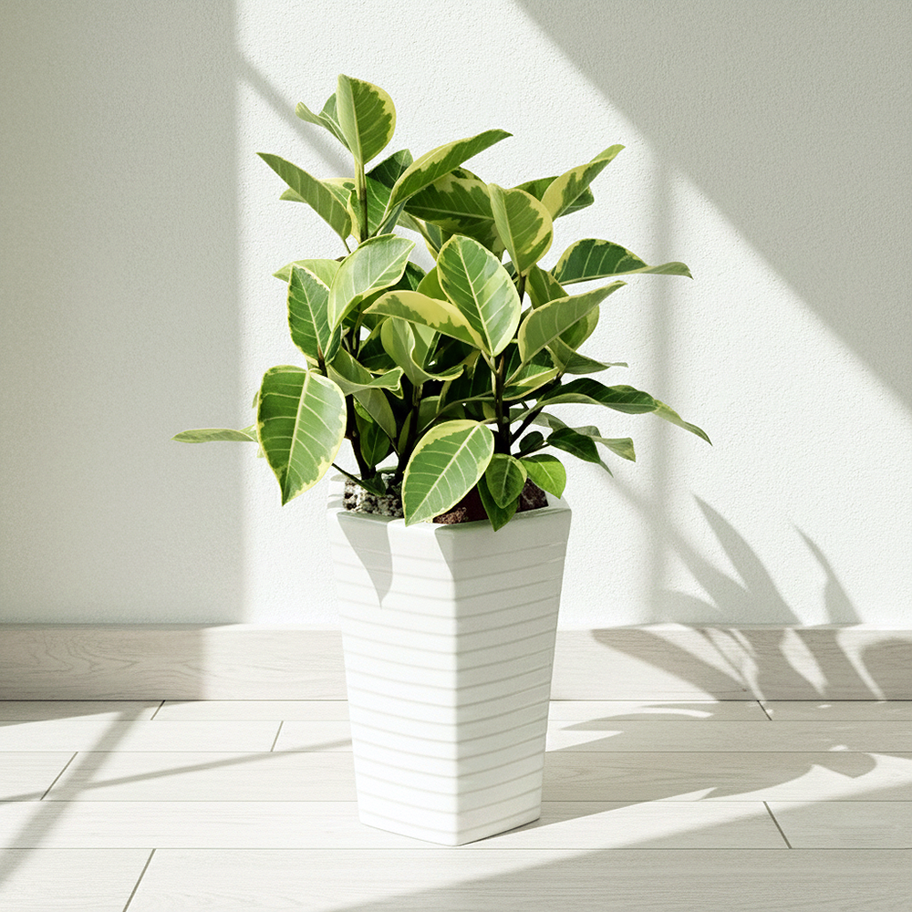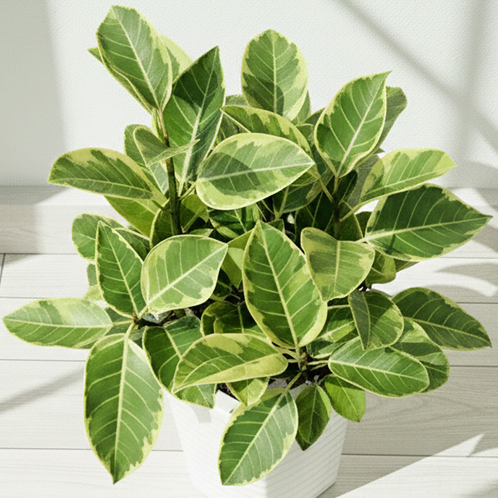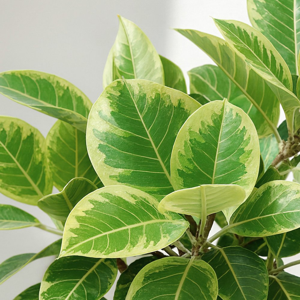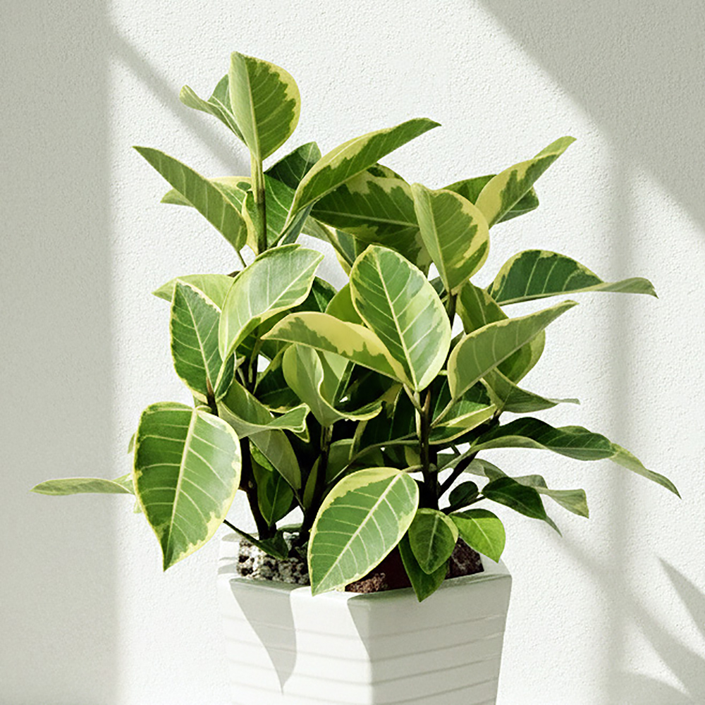 곧은 나뭇가지위에 녹색의 잎이 모여피는 모양새로 고무나무중에서도 잎색깔이 특이합니다.